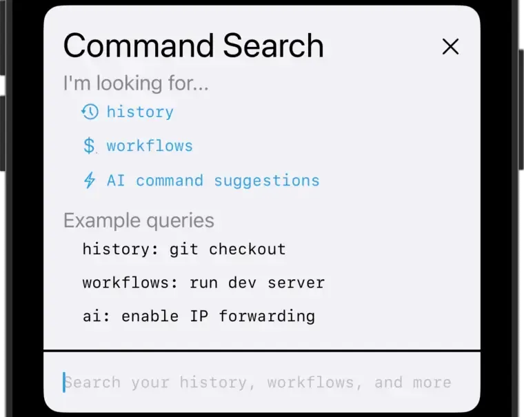 By default, Command Search will search for commands in both your history and the workflow gallery. If you want to limit your search to just workflows or your command history, you can tap “history” or “workflows”, or prefix your command search with “workflows:” or “history:”.