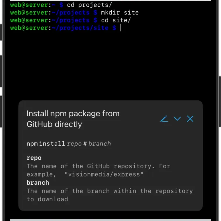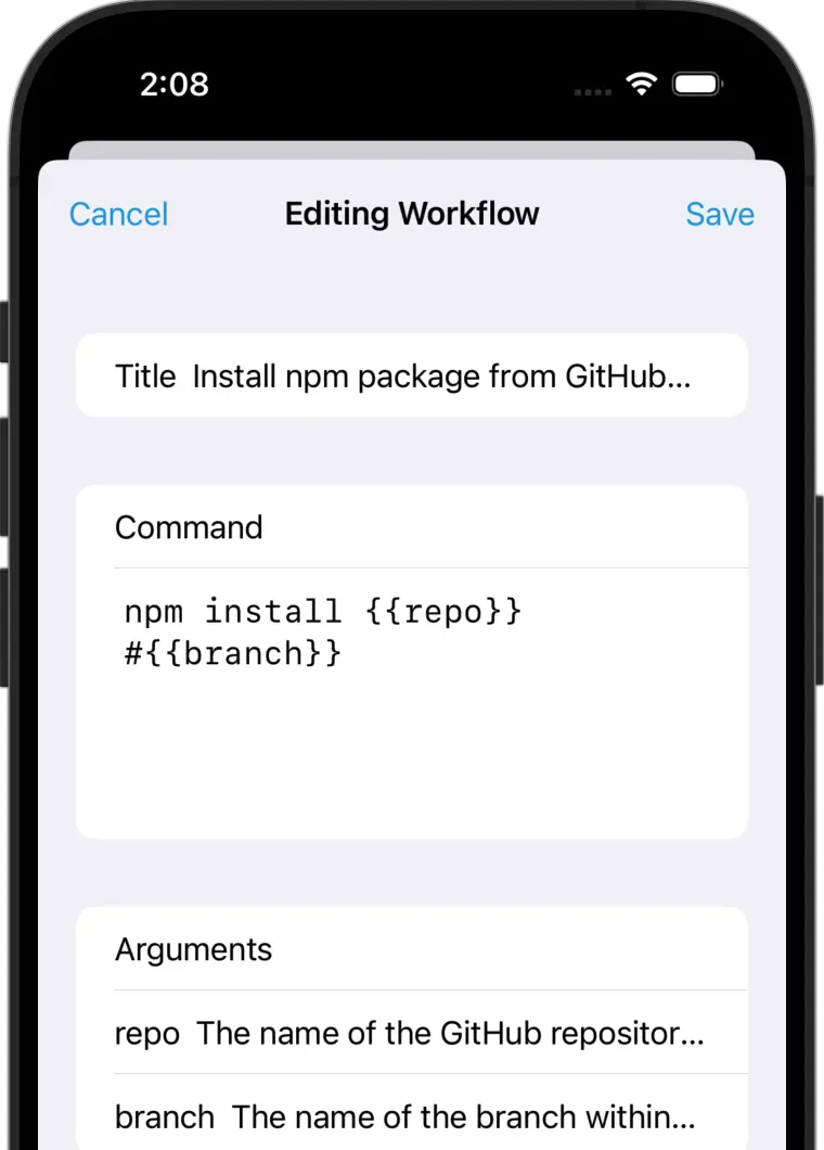 You can provide values for each parameter in the selected workflow by tapping on the italicized portion of the workflow command. Once you have filled in all of the parameters for your command, tap the down arrow or press “return”, to send the command to your open terminal session.