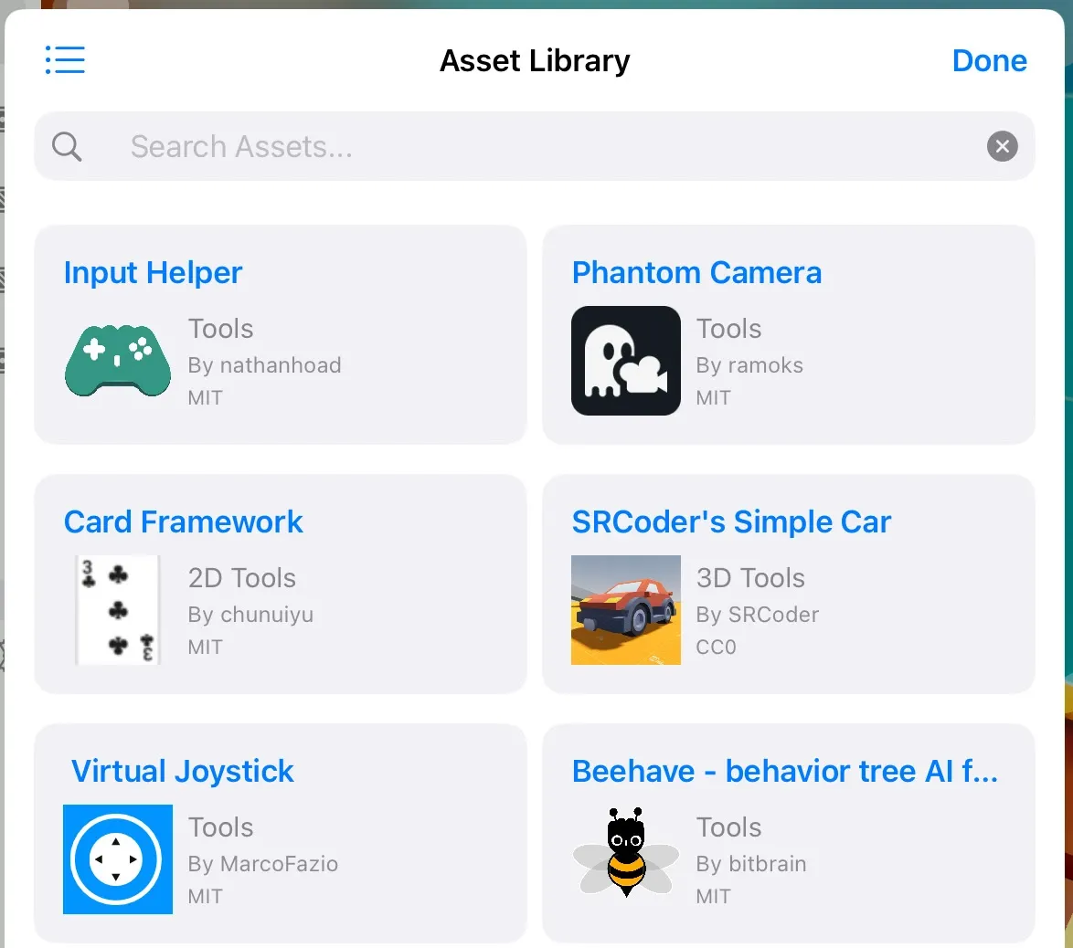 For now, we’re only surfacing a few of the most popular assets that we expect to work well with Xogot, but if there is a Godot Asset you would like to see in the Asset Library, please let us know!