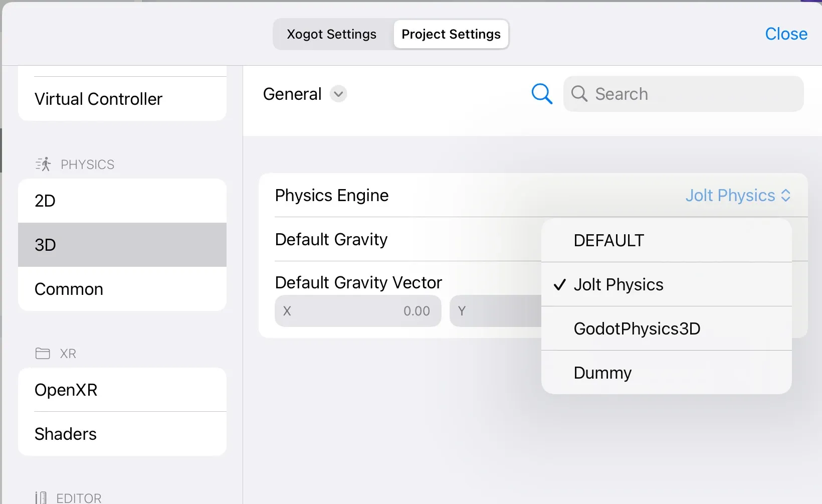 Nearly a quarter of developers who have signed up for our TestFlight indicated that they use the Godot Jolt Extension for 3D Physics, so we’re very excited to announce that Xogot now ships with the Jolt physics engine - no native extension required.