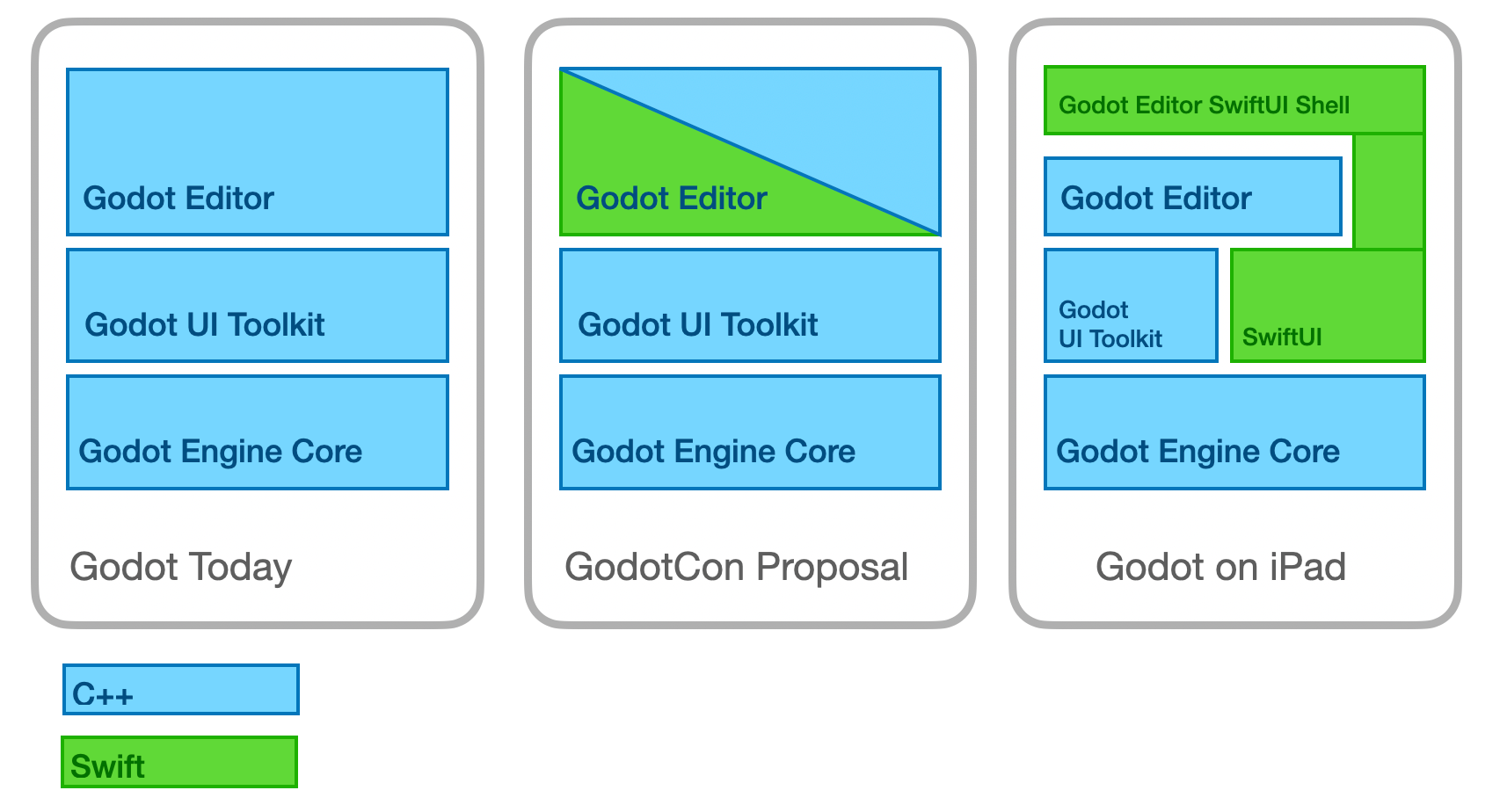 My current effort is slightly different: how to build a native iPadOS (and hopefully VisionOS) experience for Godot. So rather than rewriting the existing Editor codebase with Swift, this effort is about making a SwiftUI on top of the existing Editor.