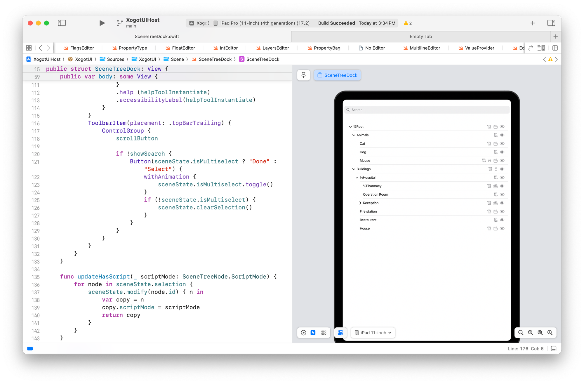 The Godot Editor relies on extensive introspection of your Godot project. Godot has a rich object model paired with an API to look inside and modify those objects entirely. Luckily, almost all the capabilities I need to build an editor have surfaced in Swift via my SwiftGodot bindings. Luckily for the community of SwiftGodot users, the more I work on Godot for iPad, the better the bindings get. And also luckily for me, SwiftGodot has attracted a community of lovely contributors that also make my job a lot easier.