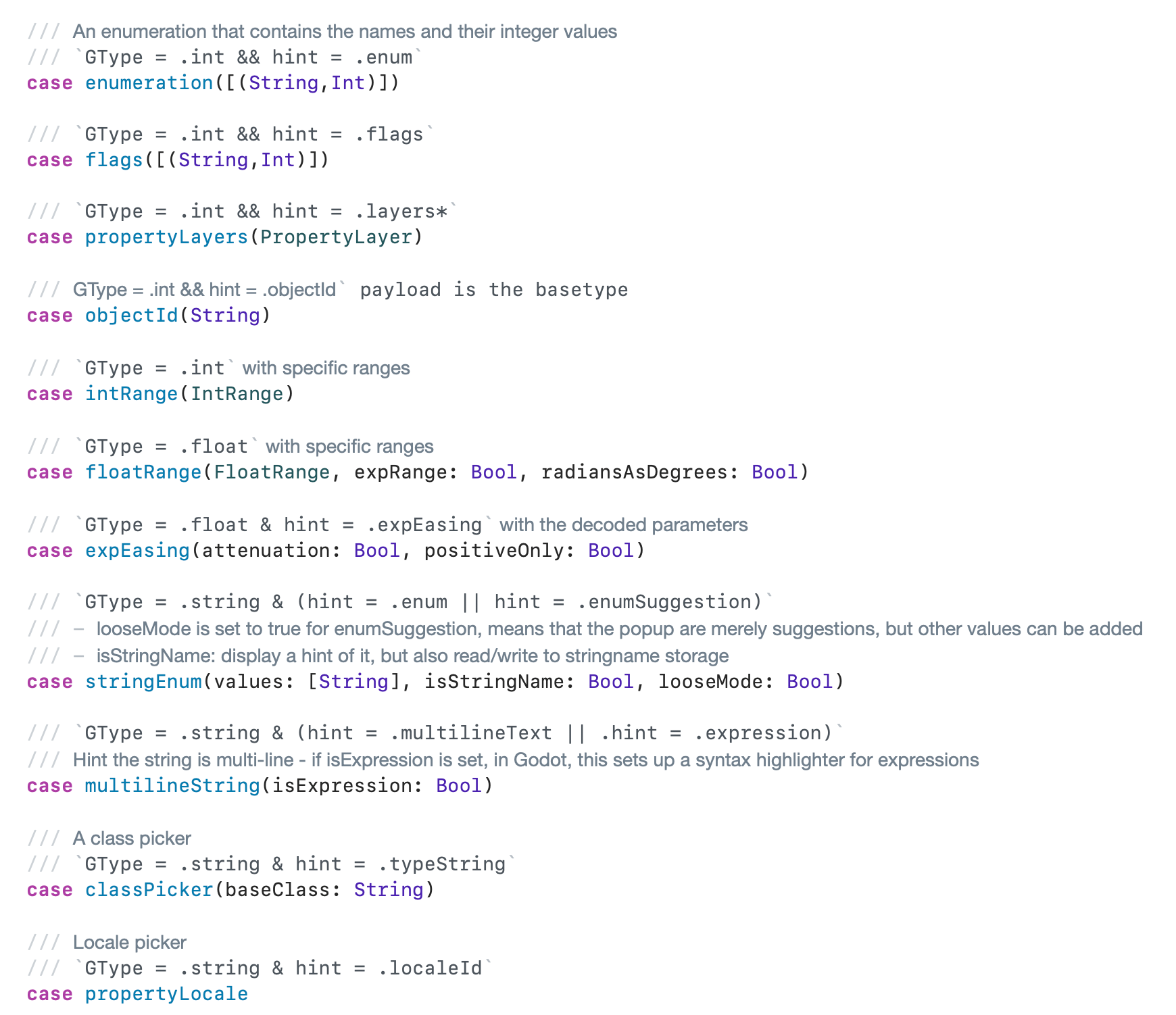But the type is peculiar. Half of it is made out of the actual storage for the object (a string, a vector, an object, a dictionary - Godot calls this the Variant type), and the other half is semantic information about how to represent the data type in the UI. You could have a "Background Image" property stored as a "string," with a semantic payload that describes it as "This should be edited as a file picker that tends to have PNG or JPG extensions."