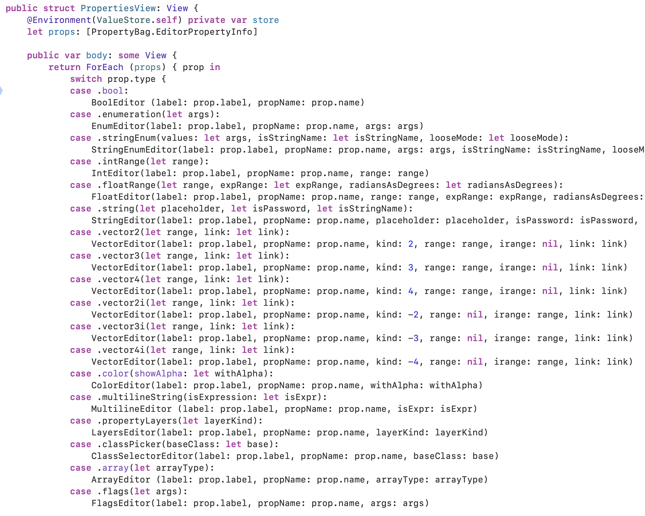 The properties are rendered using SwiftUI with a switch statement that looks like this: