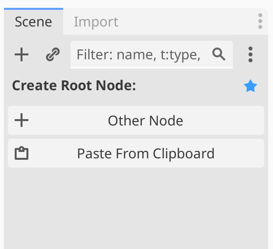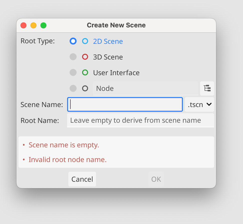 This UI steers you towards assigning a name and choosing a starting node (3D, 2D, UI). The name is important, and this is different than the existing Godot workflow, and I will discuss why in the next section.
