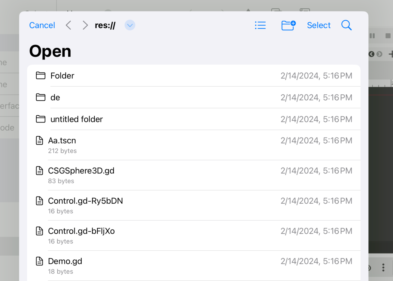 If you want to pick a file from all of the project files instead of being limited to the three buckets above, you can tap on that folder icon, and this hand-crafted SwiftUI UI shows up. SwiftUI really shines at letting you write UIs like this with very little code: