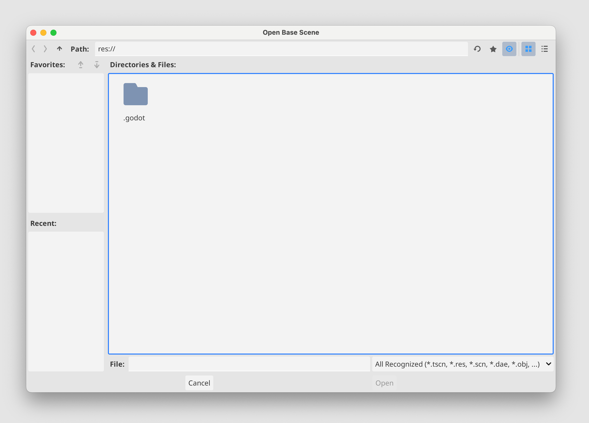 For the "New Inherited Scene" option, rather than dumping the user into a file picker, I populate the list with possible scenes, so the user just needs to change from "New" to one of the valid scenes to inherit from: