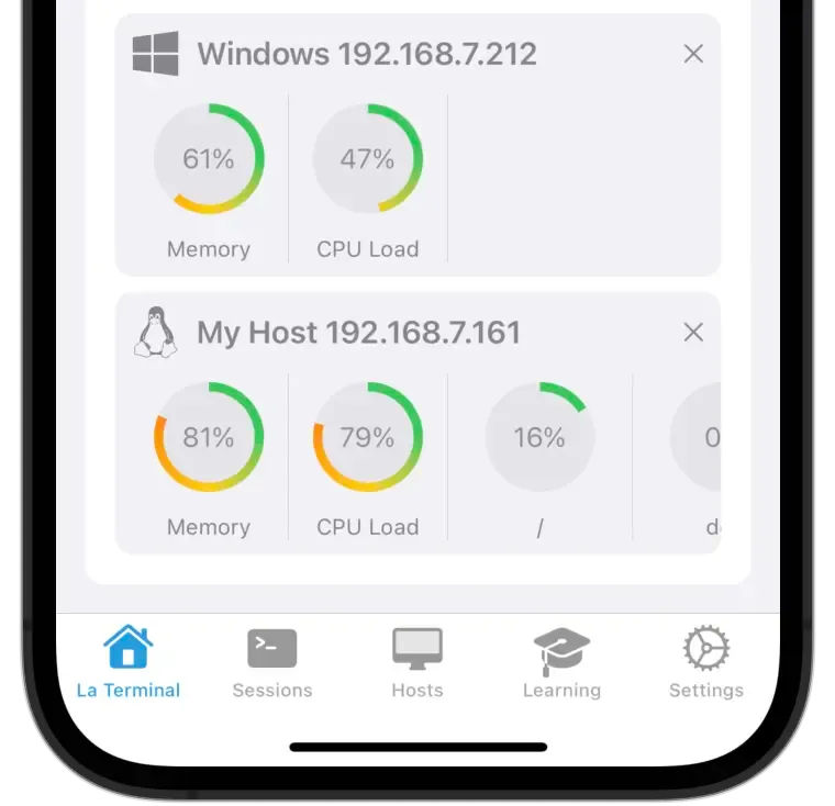 Use Host Monitoring to pin a view of your favorite hosts’ key metrics, including CPU, Memory, and hard-disk utilization, in the dashboard on La Terminal’s home screen.