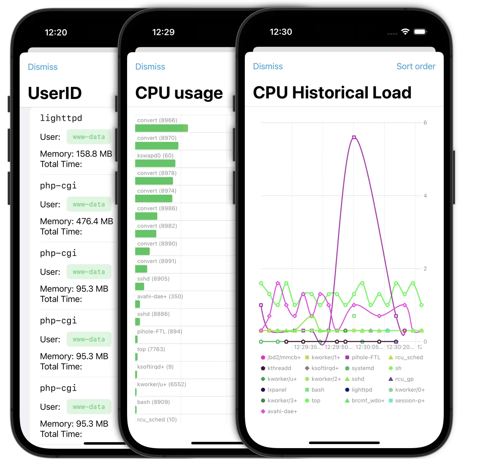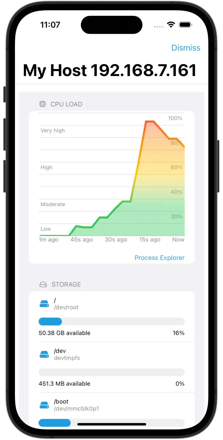 Tapping on any monitored host in the home screen dashboard will take you to a detailed view of the server, with a graph of CPU load over time and storage utilization. For more detail, tap Process Viewer to see which processes consume different resources.