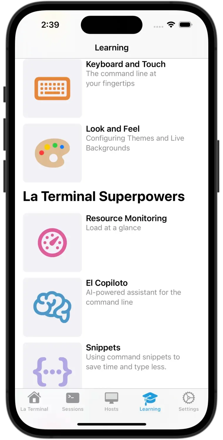 We've integrated documentation directly into the app to help you become the badass terminal operator you always dreamt of being. Visit the Learning tab to see how you can take advantage of modern image support and command snippets, keep connections alive with El Preservador, protect your SSH keys with Apple's Secure Enclave, or get help crafting commands with El Copiloto - La Terminal's AI-powered command-line assistant.