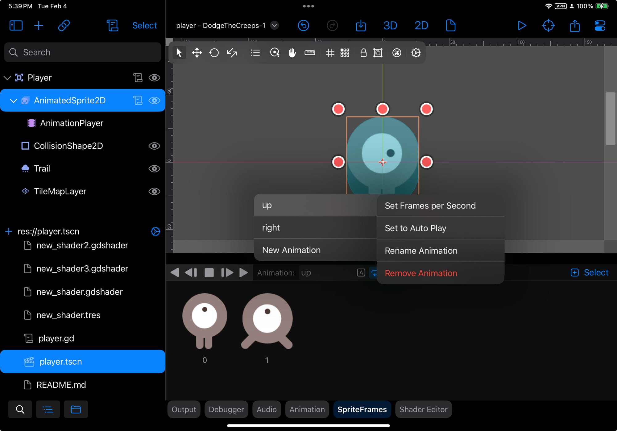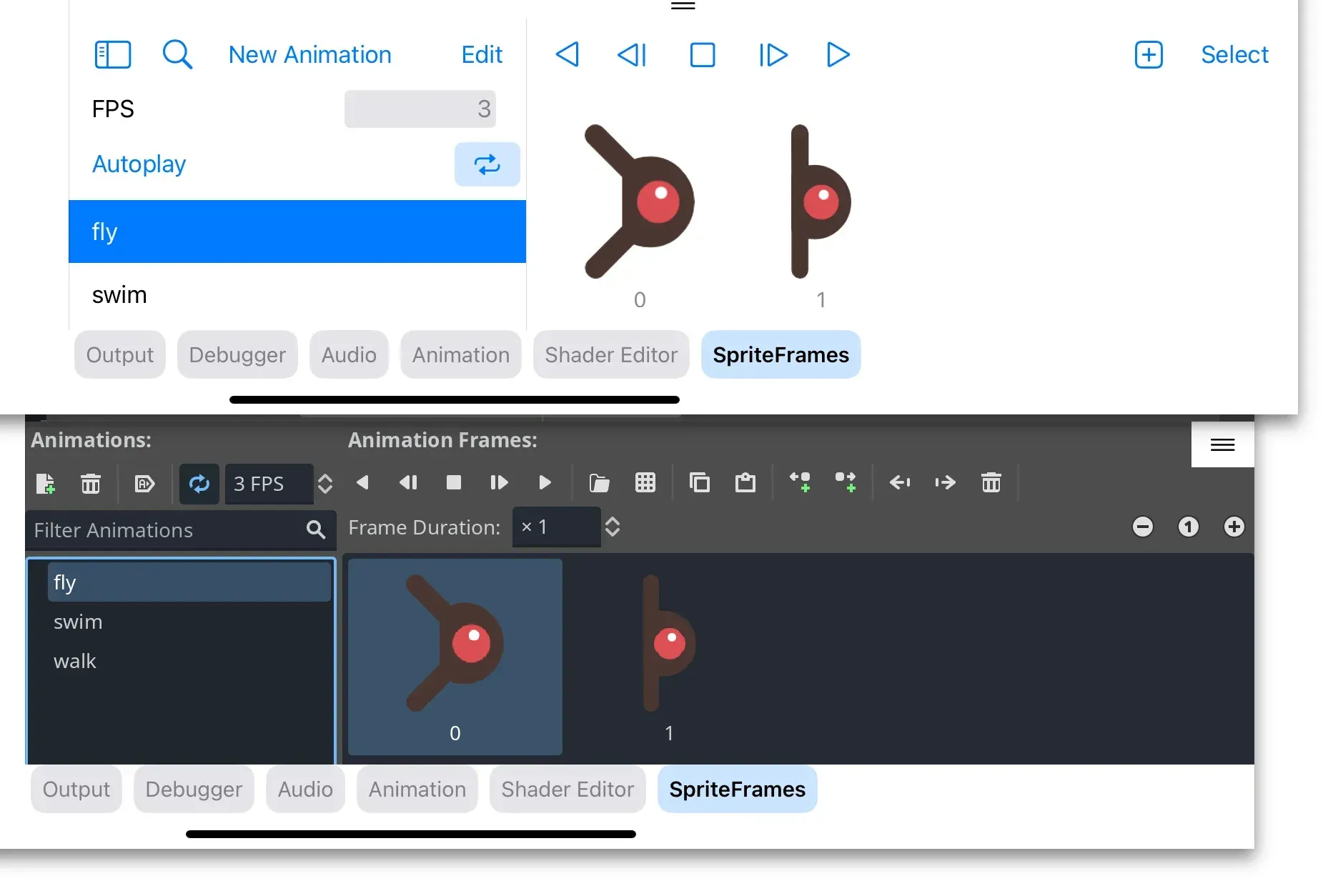 While it is slightly cleaned up, fundamentally it uses the same layout as Godot's UI - and I have never been quite happy about it. As I was writing this blog post, I realized that I did not like the player controls in the middle of the screen, that I hated the left side-bar taking all that space, that the FPS/Autoplay/Repeat controls felt capricious and were bound to an animation. And here I was, basking on the glory of the new Animation Tab, and realized - that I could vastly improve the SpriteFrame tab if I borrowed the playback controls, and moved away from a master/detail hierarchy for the sprite animations into a system similar to the animations tab. The pop-up menu would now host the key operations of an animation, and we would gain the space from the left column.