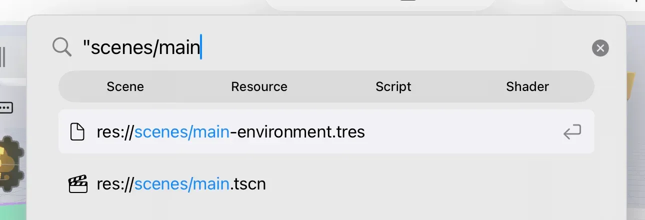 Start typing and you’ll get real-time fuzzy-matched results across your project. Select a file to open it in the appropriate place. E.g., text files go to the script editor, scenes open in the 2D/3D editor, and resources open in the appropriate viewer, etc.